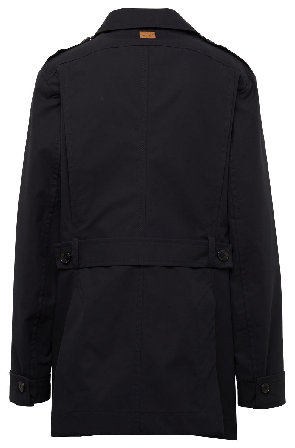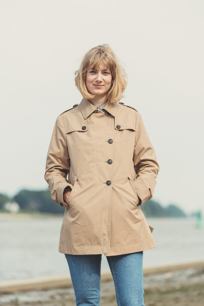 O clássico trench foi a inspiração para nossa cidade- casaco curto Franziska amigável. Isso pode ser visto na frente assimétrica e protetora, que lembra o clássico terno trespassado.