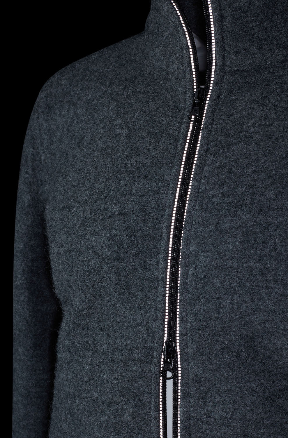 Aquece graças ao uso de lã tricotada de 430 gramas/metro quadrado da fábrica de tecidos Moessmer, protetora no escuro graças ao refletivo 2 Zíper e debrum refletivo nas costas.