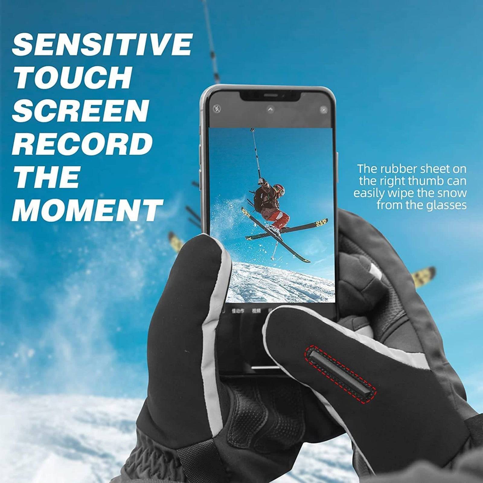 - As pontas dos dedos indicador e polegar de nossas luvas de esqui são feitas de tecido condutor. O design com tela sensível ao toque permite que você use seu telefone sem precisar tirar as luvas. É conveniente para tirar fotos e vídeos e atender chamadas enquanto esquia. Você também pode usar seu dispositivo de navegação enquanto dirige.